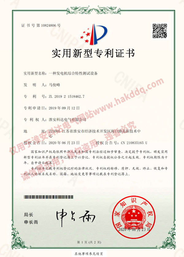發(fā)電機綜合特性測試設備專利證書